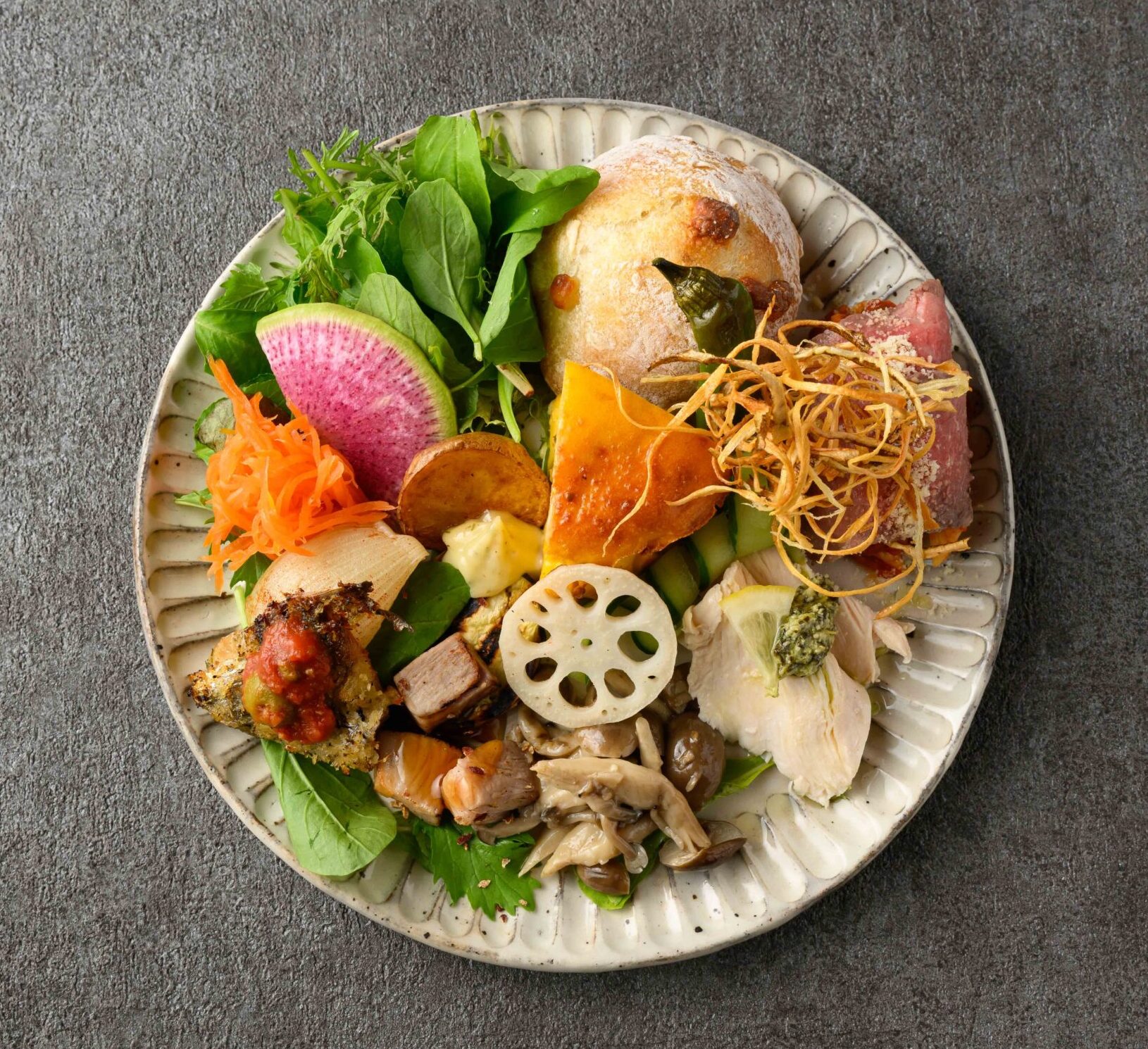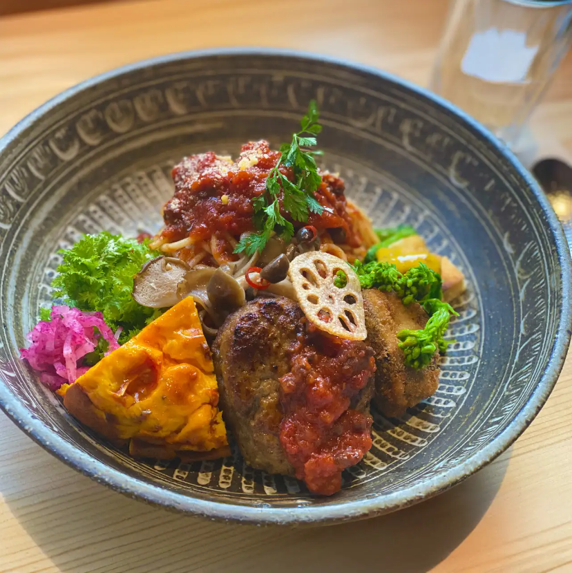 ハンバーグ・インヴォルティーニなどおかずも楽しめるひと皿です。